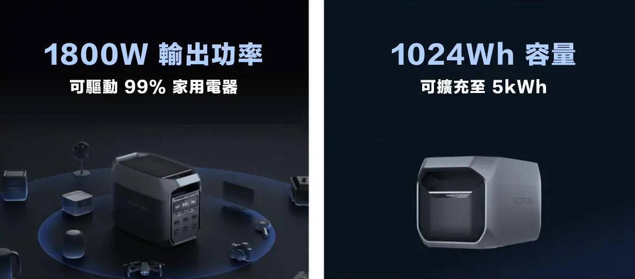 搭配 DELTA 3 擴充電池、DELTA Pro 3 擴充電池、DELTA 2 擴充電池或 DELTA 2 Max 擴充電池,儲電容量可擴充至 1~5kWh