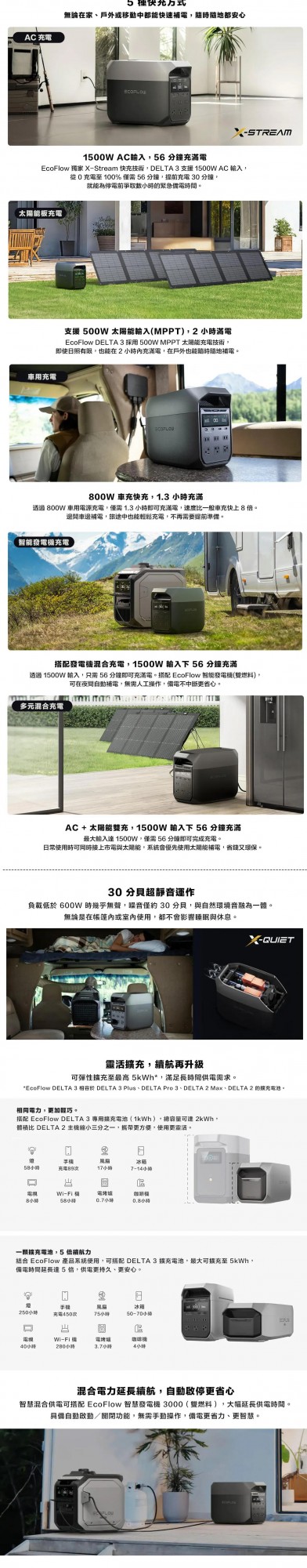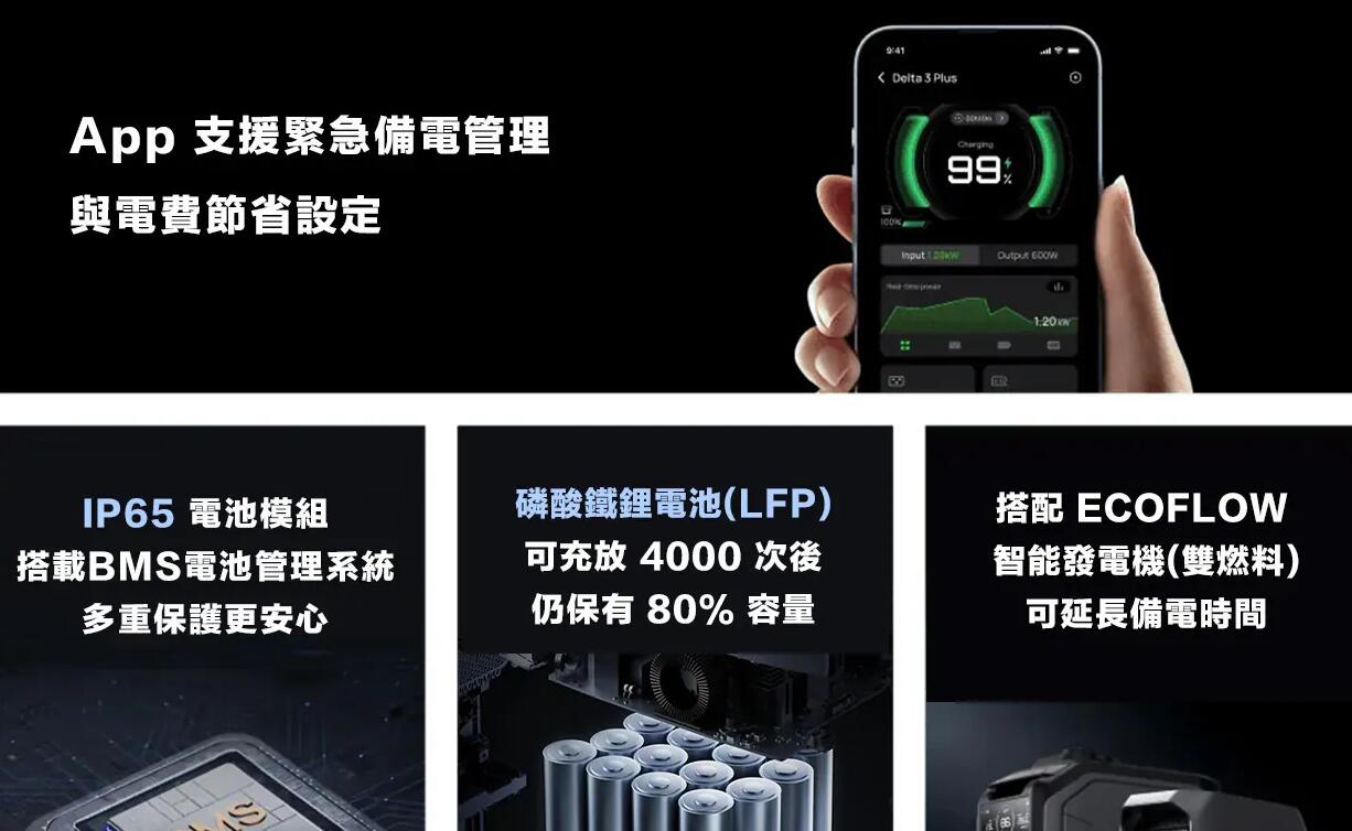 支援 5 種快速充電方式:市電、太陽能、800W 車用發電機、3000W 智慧發電機(雙燃料)、多元混合充電