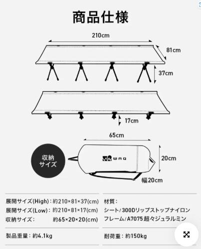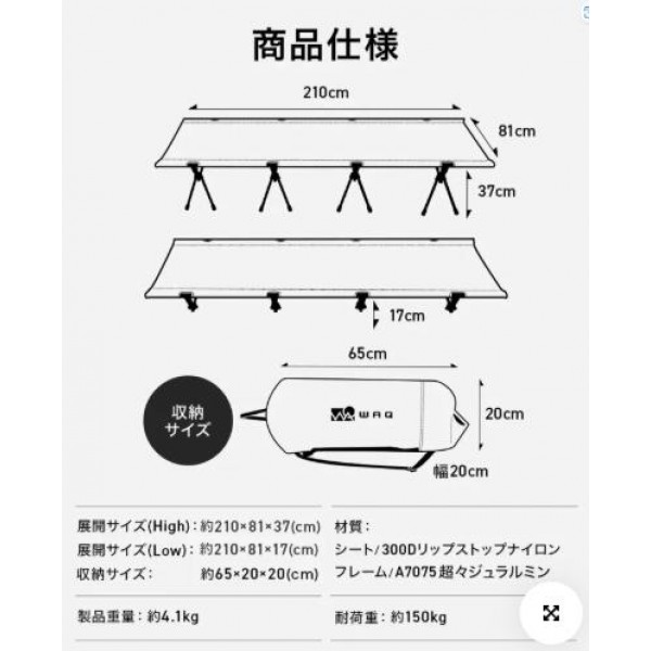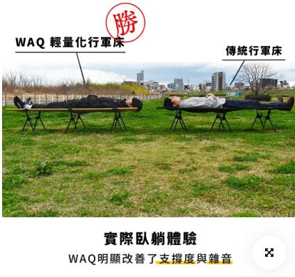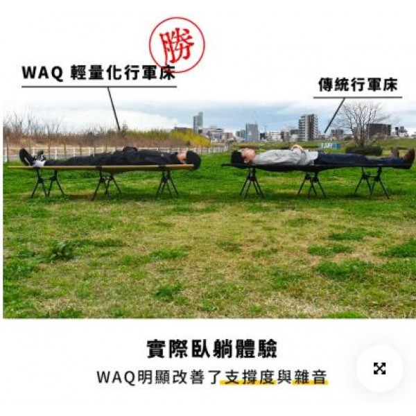 此版本為 WAQ 最新推出的寬版行軍床,獨有的超寬超長床面,讓壯碩的男性也能有舒適的體驗,WAQ 的行軍床 CP值一直是許多使用者讚賞的,可使用低板與行軍床增高腳,在帳篷內都很好搭配!