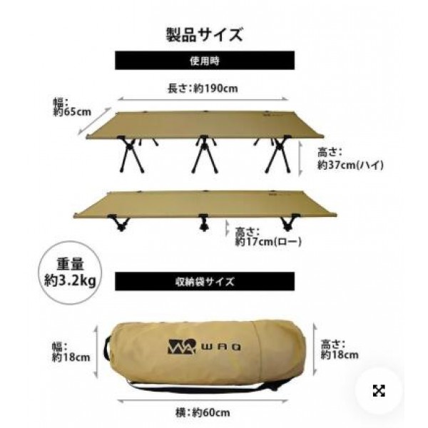 ■ 使用尺寸:長190 × 寬67 × 高37 / 17cm■ 收納尺寸:長54 × 寬16 × 高16cm■ 重量:3.2kg■ 耐荷重:150kg■ 內容物:行軍床主體、增高腳、收納袋。